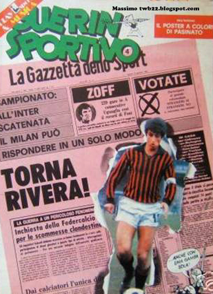 D'abord, Milan A.C., le club de Gianni Rivera, qui remporta enfin son dixième titre l'an dernier, grâce à la présence, sur le terrain, de son glorieux avant-centre. Mais, à trente-cinq ans, on passe la main et cette année, le club rouge et noir se contente d'une seconde place : Gianni Rivera observe cette régression depuis son fauteuil directorial et ne reviendra pas sur sa décision de ne plus porter le maillot qui le rendit célèbre. Place aux jeunes en quelque sorte. C'est ce que fit, à deux pas, son voisin et ami Sandro Mazzola, il y a deux ans. Et depuis, l'inter a pris peu à peu de l'assurance jusqu'à prendre aujourd'hui les commandes du championnat italien : à la vingt-troisième journée, soit donc à sept longueurs de la ligne d'arrivée, les porteurs du maillot bleu et noir (sémillante tenue !) ont huit points d'avance. Et l'on voit mal qui, derrière, serait capable de les rattraper : Milan A.C.? Juventus? Ascoli? Rome? L'inattendue Avellino? Le Pérouse de Paolo Rossi ?