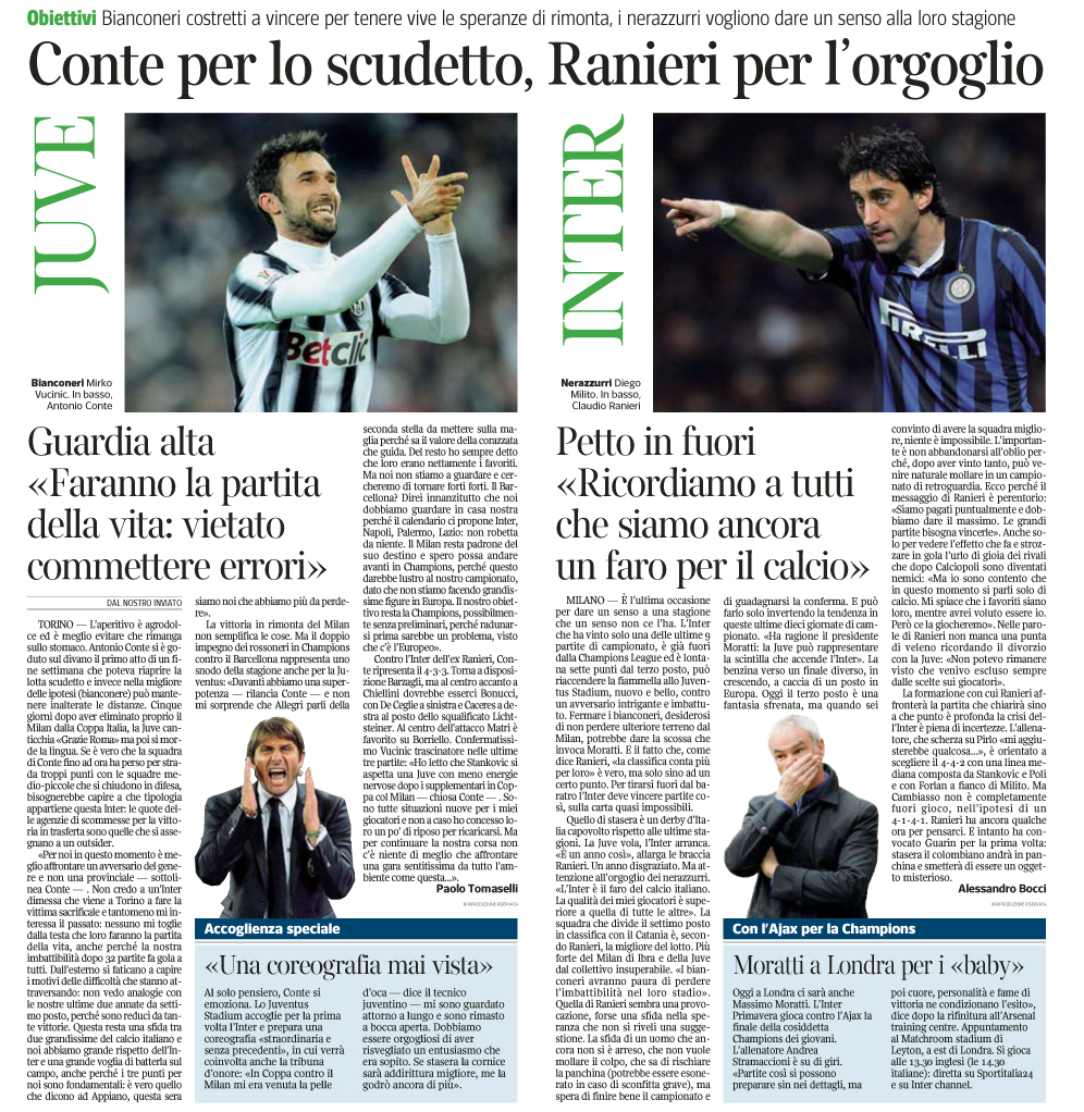 Pour ce classique historique en Italie, la Juve et l'Inter avaient décidé de ne pas décevoir le public du Juventus Stadium, rempli et donnant à ce match une ambiance à la hauteur de l'événement. Si le club milanais n'avait plus que son orgueil en jeu, la Vieille Dame se devait de gagner dans le cadre de son mano a mano avec l'AC Milan. Mission réussie avec une victoire obtenue au terme d'un match particulièrement réjouissant (2-0). Forcément, les Bianconeri étaient les premiers à attaquer dans cette rencontre bien fournie en occasions de buts. C'est pourtant Milito, d'un enchainement rapide, qui portait le danger le premier sur les buts d'un Buffon exemplaire (14e).